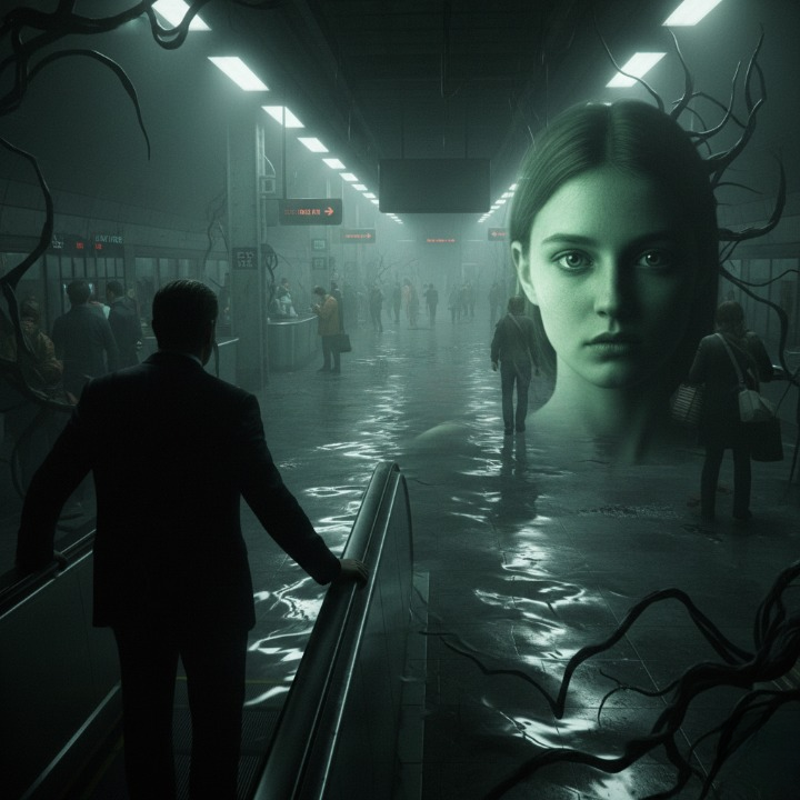 He looks down at her and suddenly, for a moment, the entire space around them – the escalator, the landing, the teeming subway station, the constant stream of people flowing in and out, the rows of ticket counters, everything in fact – flickers and wavers. Just like the ripples on the surface of a still lake when a pebble is dropped into it.